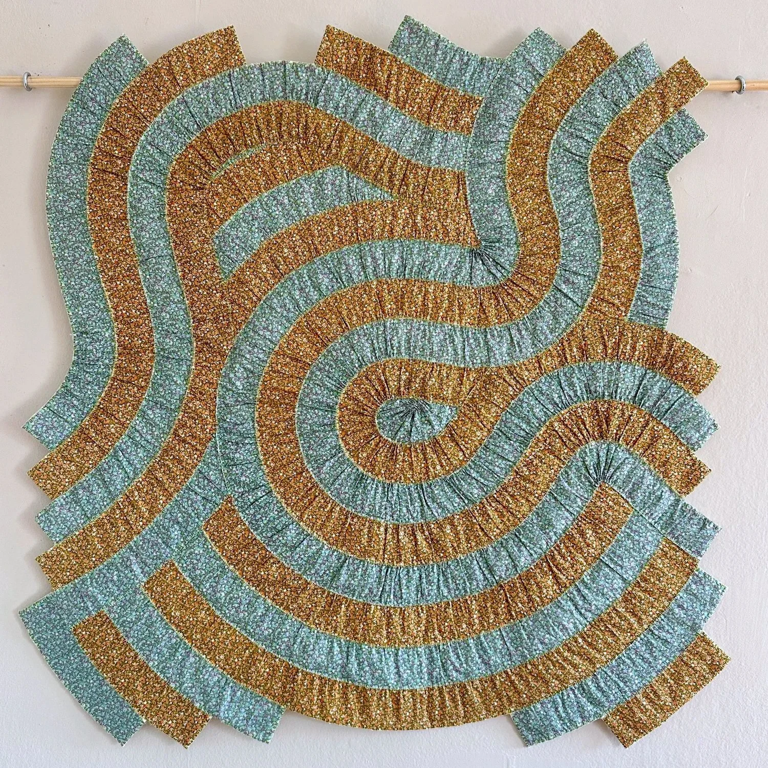 What emerged was an undulating scene, reminiscent of light on water, rolling hills late in the day, topographical maps. Initially, I planned to quilt it on the machine, but it felt quite violent to crush these gentle curves with the harsh lines of a zig-zag stitch. A single neon thread felt appropriate. It added a subtle glow to the piece, and, as a happy byproduct, made the back look very cool.