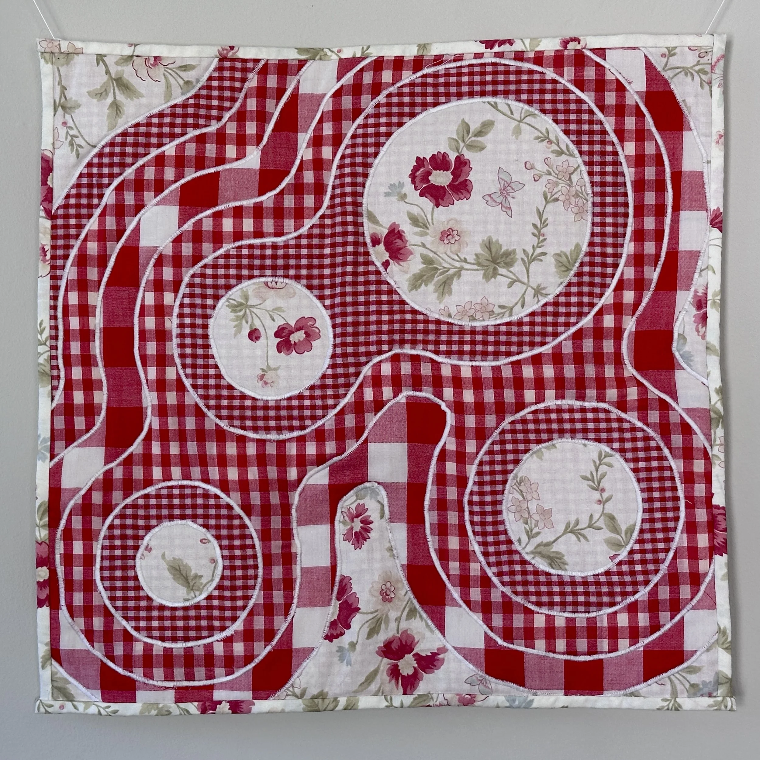 This quilt was an exploration of curved shapes, cutting away excess to reveal the layers underneath. I wanted it to feel like you were seeing into something – down into the depths – the different size squares indicating distance or thickness.