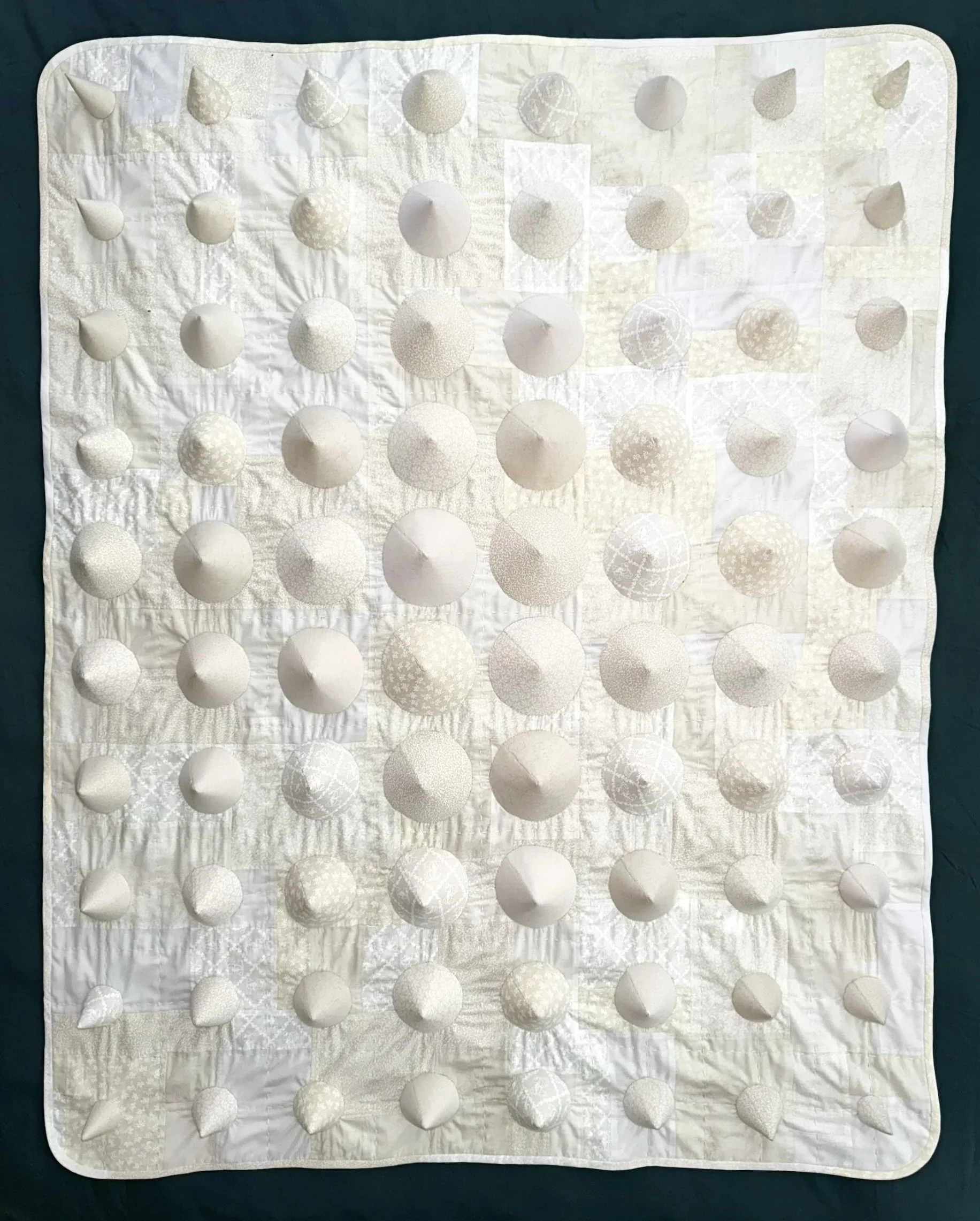 Out of the Ether came to me in a dream. I was small – mouse sized – and exploring a terrain made of white cones – each a different size and texture, each smooth and monumental. When needle actually hit fabric, certain concessions had to be made.