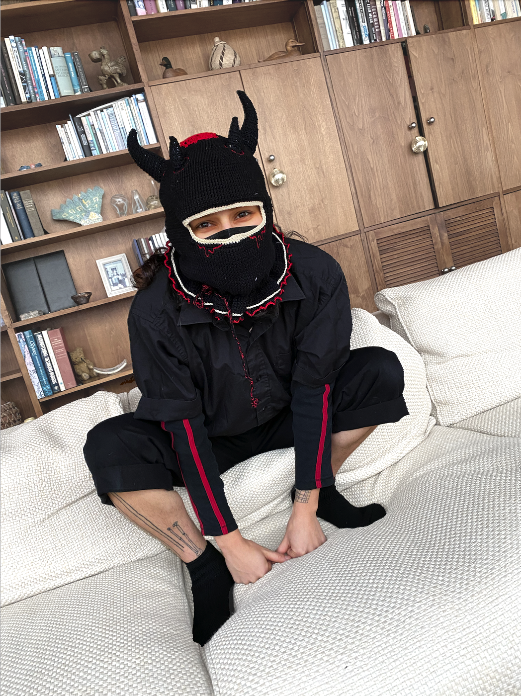 This balaclava and it’s embellishments were crocheted freehand, using cotton thread. The drawstring in the neck creates a secondary ruffle in the garment – this demon isn’t just warm, he’s fancy.