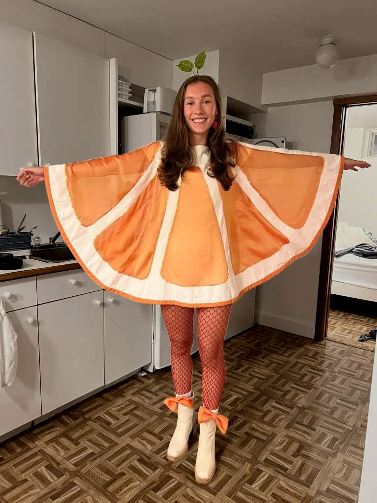 The earrings are tiny bags of oranges (pompoms, stuffed into a garlic bag from the grocery store), and the red fishnet tights reference the typical red net that oranges come in. Not pictured: a little purse that is also a bag of oranges.
